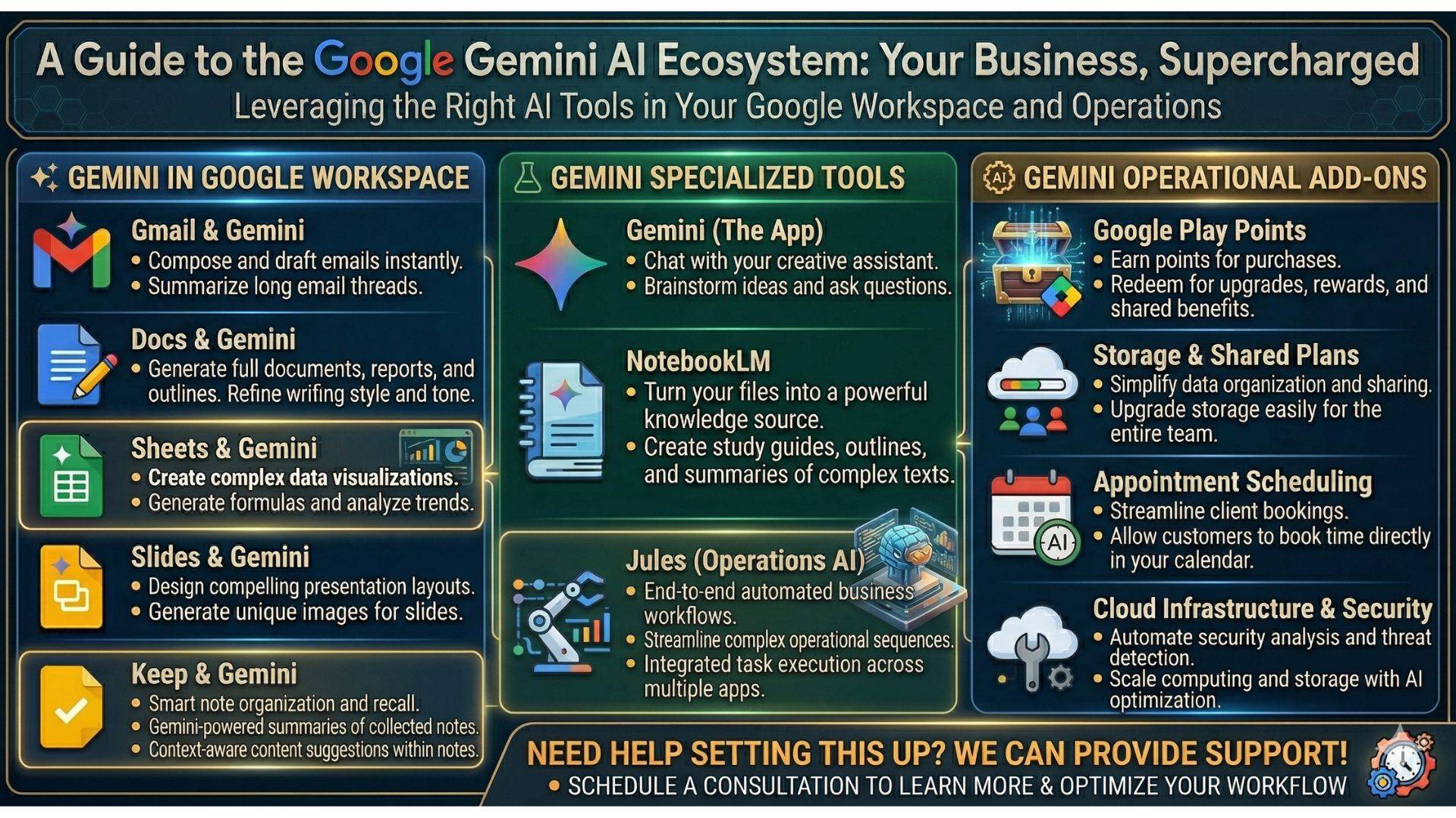 The image below is a simplified view of how the Google Gemini ecosystem can support business operations across communication, documentation, data, and execution.
